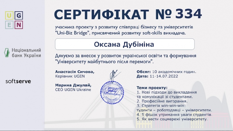 «Uni-Biz Bridge» від агенції UGEN - це всеукраїнський проєкт з розвитку співпраці бізнесу та університетів, мета якого побудувати міст взаємодії між бізнесом та закладами вищої освіти України.