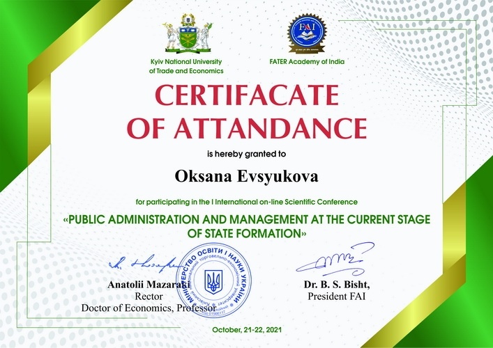 - брала участь у міжнародній науково-практичній онлайн-конференції “Публічне управління та адміністрування на сучасному етапі державотворення” (21-22 жовтня 2021 року м. Київ), яка відбулася за сприянням таких установ, як: Міністерства освіти і науки України, Київського національного торгівельно-економічного університету, Академії EATER Індія (FAI), Національного агентства України з питань державної служби, Ужгородського національного університету та інших партнерів з Таїланду, Бразилії, Республіки Польща.