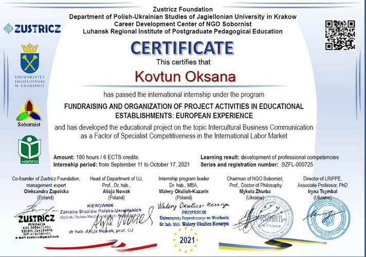 Ковтун Оксана Анатоліївна, кандидат наук з державного управління, доцент, професор кафедри публічного управління та проєктного менеджменту брала участь у міжнародному стажуванні для педагогічних та науково-педагогічних працівників «Фандрейзинг та основи проєктної діяльності в закладах освіти (європейський досвід)», організаторами проведення якого стали: Фундація «Зустріч» (Республіка Польща) спільно з кафедрою Польсько-Українських Студій Ягеллонського університету (Республіка Польща), Луганським обласним інститутом післядипломної педагогічної освіти (Україна) та громадською організацією «Соборність» (Україна).