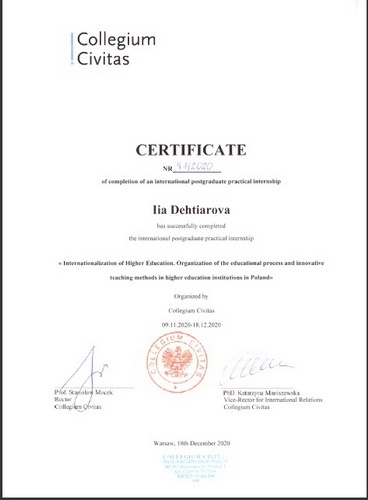 Дегтярьова Ія Олександрівна, доктор наук з державного управління, професор, професор кафедри публічного управління і проектного менеджменту брала участь в інтернаціональній освітній програмі «Інтернаціоналізація вищої освіти. Організація навчального процесу та інноваційні методи навчання у вищих навчальних закладах Польщі» за сприянням Collegium Civitas w Warszawie.