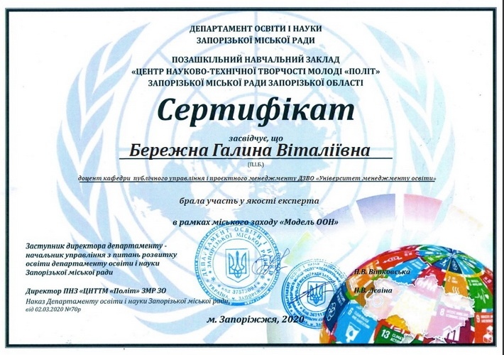 - брала участь у якості експерта у межах міського заходу «Модель ООН», що відбувся за сприянням Департаменту освіти та науки Запорізької міської ради та позашкільного навчального закладу «Центр науково-технічної творчості молоді «Політ» Запорізької міської ради Запорізької області.
