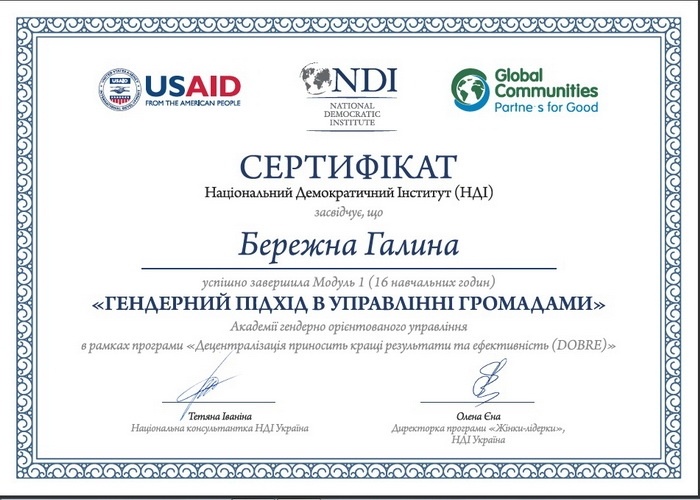 - брала участь у міжнародному стажуванні Національного Демократичного Інституту за сприянням Академії гендерно орієнтованого управління в рамках програми «Децентралізація приносить кращі результати та ефективність (DOBRE)»:
