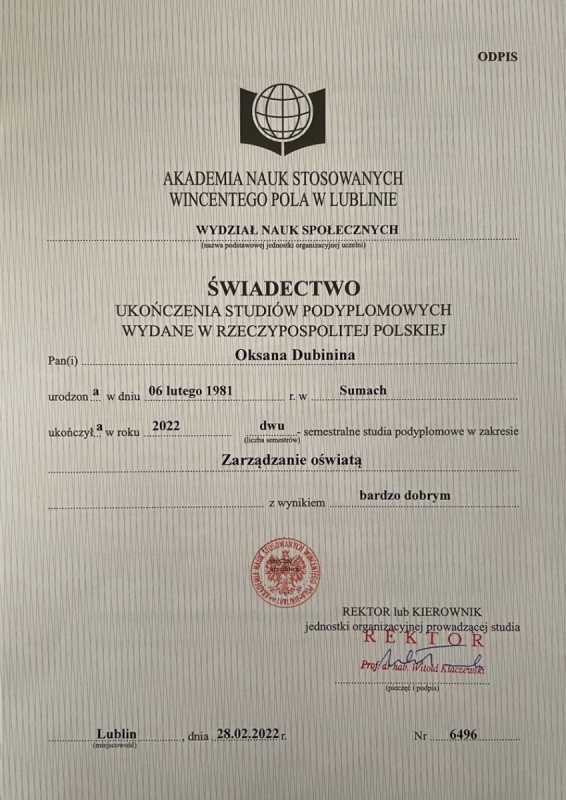 -пройшла підвищення кваліфікації за напрямом Управління освітою/Zarządzanie oświatą» на базі Вищої школи суспільно-природничих наук імені Вінцента Поля в Любліні (WYŻSZĄ SZKOŁĄ SPOŁECZNO – PRZYRODNICZĄ IM. WINCENTEGO POLA W LUBLINIE (Lublin, Polska) (терміни курсів 1 березня 2021 - 28 лютого 2022 р.);