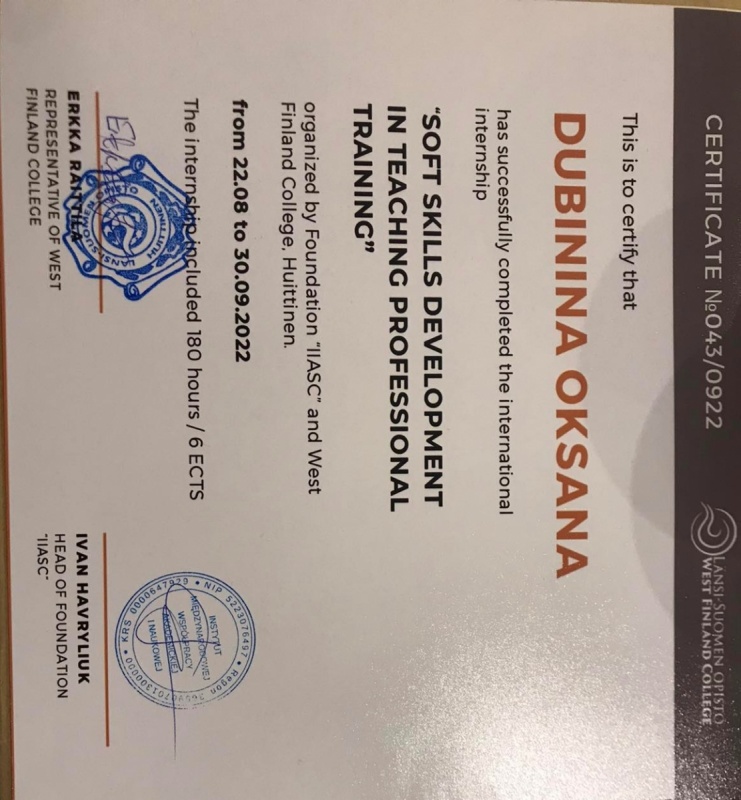 - пройшла міжнародне стажування за темою: “Розвиток м'яких навичок у професійній підготовці викладачів” / “Soft skills development in teaching professional training” на базі Західно-Фінляндського Коледжу, м. Гуйтінен (Фінляндія).