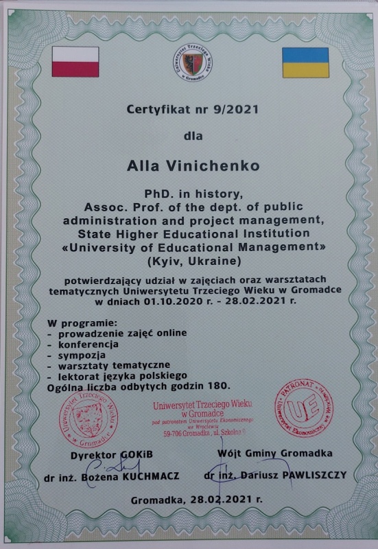 Вініченко Алла Анатоліївна, кандидат історичних наук, доцент кафедри публічного управління і проектного менеджменту брала участь у Міжнародному науковому стажуванні в Університеті третього віку (м. Громадка, Республіка Польща),