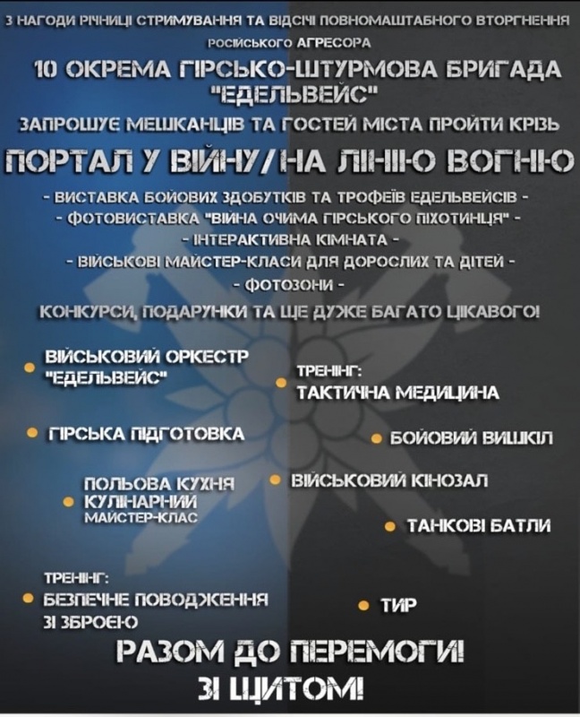 Державна служба якості освіти України запрошує відвідати виставку «Портал у війну/на лінії вогню», що організовується 10 окремою гірськоштурмовою бригадою «ЕДЕЛЬВЕЙС» (афіша додається). Виставка відбудеться з нагоди річниці стримування та відсічі повномасштабного вторгнення російського агресора на територію України та буде проходити у період з 24.02.2023 до 28.02.2023 за адресою: Наукова бібліотека імені М. Максимовича Київського національного університету імені Тараса Шевченка, вулиця Володимирська, 58, м. Київ.