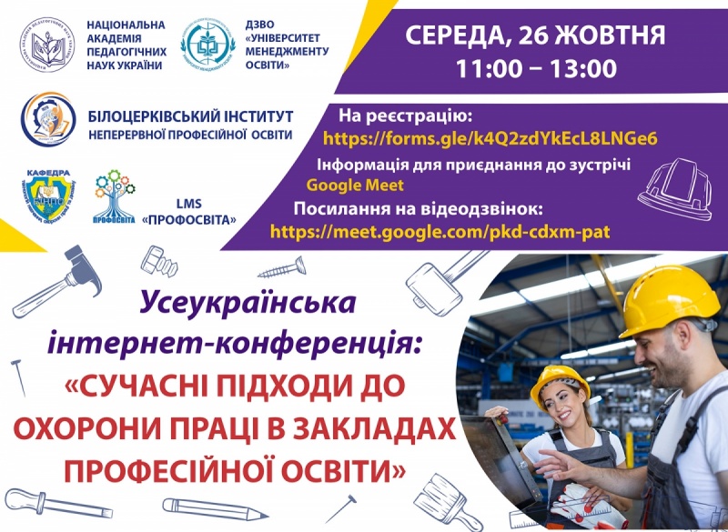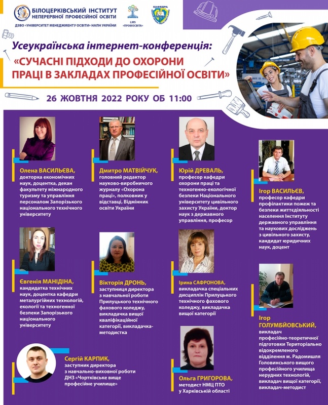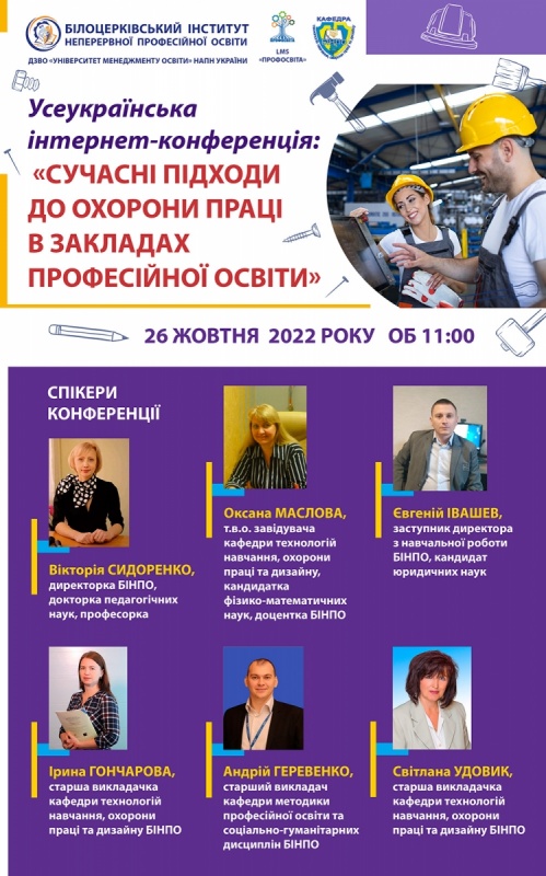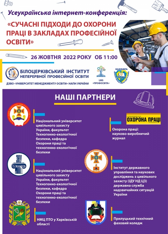 26 жовтня 2022 року об 11:00 Білоцерківський інститут неперервної професійної освіти ДЗВО «УМО» НАПН України запрошує взяти участь у Всеукраїнській інтернет-конференції: «Сучасні підходи до охорони праці в закладах професійної освіти».