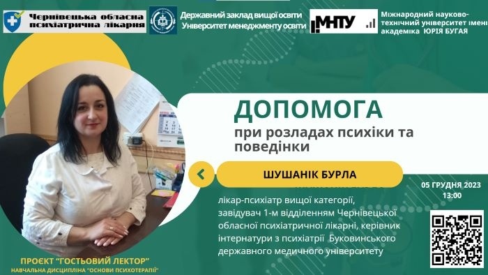 05 грудня 2023 року о 13:00 год. у Вас є унікальна можливість відвідати лекцію в рамках проєкту «Гостьовий лектор» лікаря-психіатра вищої категорії, завідувача 1-м відділенням Чернівецької обласної психіатричної лікарні, керівника інтернатури з психіатрії Буковинського державного медичного університету Шушанік Бурли для здобувачів вищої освіти за спеціальністю «Психологія» (в межах вивчення навчальної дисципліни «Основи психотерапії», викладач: професор, Валентина Балахтар).