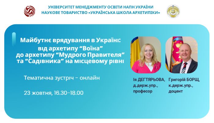 ДЗВО «Університет менеджменту освіти» НАПН України та Наукове товариство «»країнська школа архетипіки» запрошують 23 жовтня 2025 р. о 16:30-18.00 на відкриту тематичну зустріч: «Майбутнє врядування в Україні: від архетипу “Воїна” до архетипу “Мудрого Правителя” та “Садівника” на місцевому рівні».