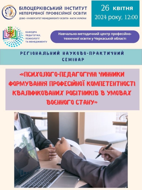 ЗАПРОШУЄМО ДО УЧАСТІ РЕГІОНАЛЬНОМУ НАУКОВО-ПРАКТИЧНОМУ СЕМІНАРІ «ПСИХОЛОГО-ПЕДАГОГІЧНІ ЧИННИКИ ФОРМУВАННЯ ПРОФЕСІЙНОЇ КОМПЕТЕНТНОСТІ КВАЛІФІКОВАНИХ РОБІТНИКІВ В УМОВАХ ВОЄННОГО СТАНУ»
