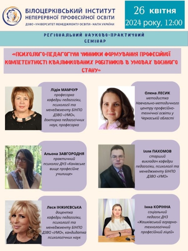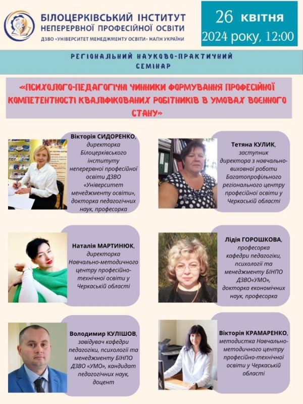 26 квітня 2024 року о 12:00 у рамках Міжнародної спеціалізованої виставки «Освіта та кар’єра – 2024» на базі Білоцерківського інституту неперервної професійної освіти спільно з НМЦ ПТО у Черкаській області відбудеться регіональний науково-практичний семінар «Психолого-педагогічні чинники формування професійної компетентності кваліфікованих робітників в умовах воєнного стану».