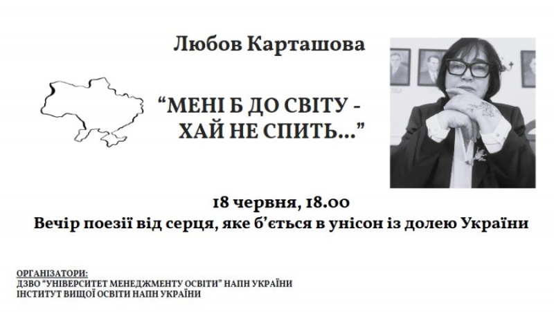 ДЗВО «Університет менеджменту освіти» НАПН України спільно з Інститутом вищої освіти НАПН України запрошує 18 червня 2025 року о 18.00 на вечір поезії Любові Карташової, доктора педагогічних наук, професора, професора кафедри освіти дорослих та цифрових технологій Навчально-наукового інституту менеджменту та психології ДЗВО «Університет менеджменту освіти.