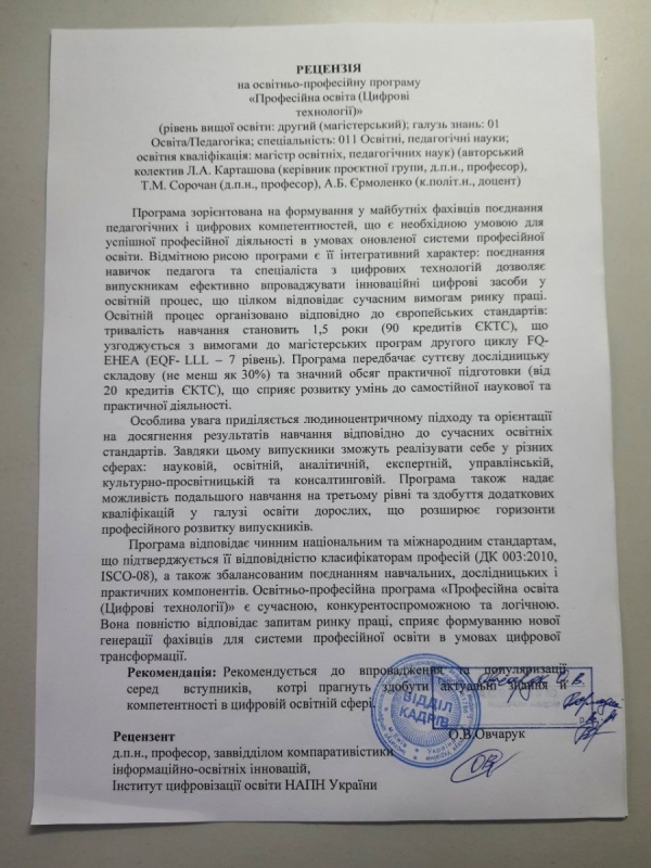 ВІДГУК зовнішнього стейкхолдера на освітньо-професійну програму Професійна освіта (цифрові технології) другого (магістерського) рівня спеціалізація: А5.39 Професійна освіта (Цифрові технології)