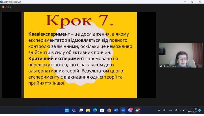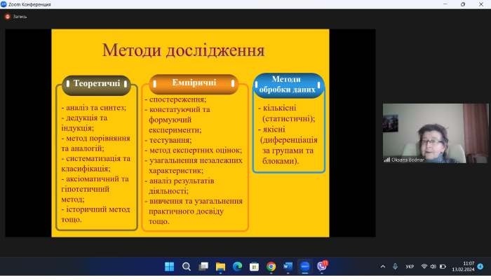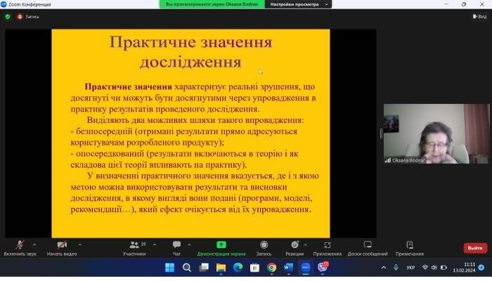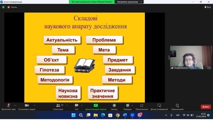 13 лютого в рамках Школи молодого науковця відбувся семінар «Алгоритм підготовки дисертаційної роботи: раціональні кроки та потенційні перешкоди», на якому виступила доктор педагогічних наук, професор Тернопільського національного педагогічного університету імені Володимира Гнатюка Боднар Оксана Степанівна